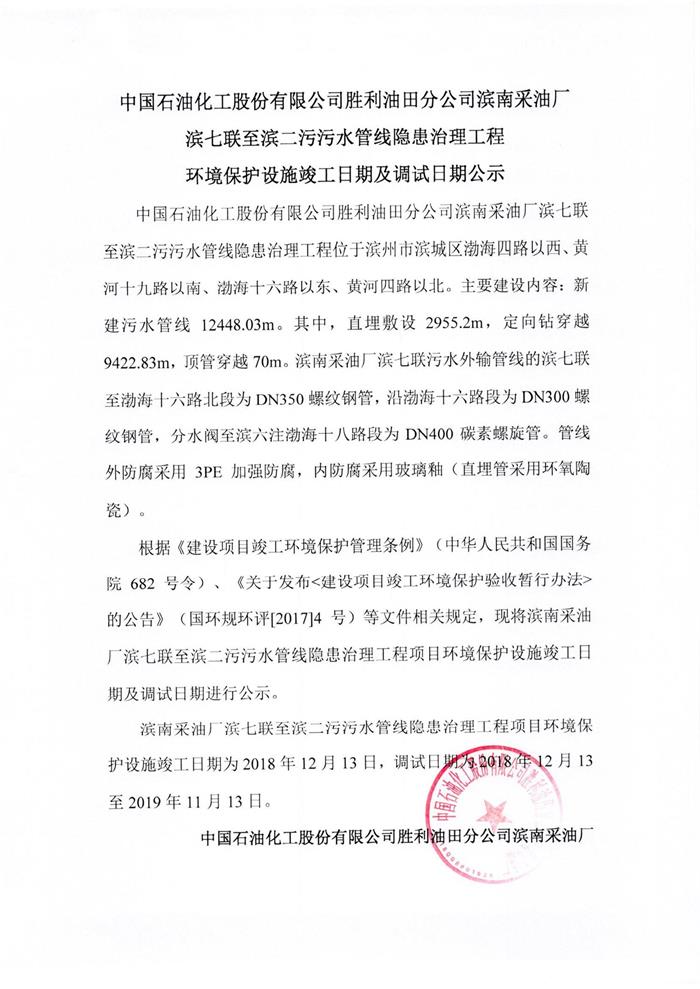 中國石油化工股份有限公司勝利油田分公司濱南采油廠濱七聯(lián)至濱二污污水管線隱患治理工程環(huán)境保護(hù)設(shè)施竣工日期及調(diào)試日期公示